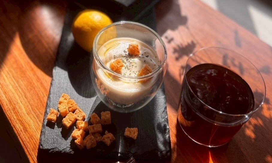 Comme'N STANDによる、コースのはじまりをやさしく彩る一皿。じゃがいものざらつきをなくしたなめらかな口当たりのポタージュに、すっきりとした味わいのコールドブリューをペアリングしました。