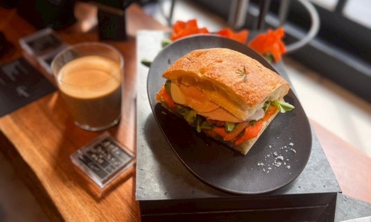 旬の春野菜をふんだんに味わえる、Comme'N STANDの食事系メニュー。ローズマリーを効かせ、見た目もかわいいフォカッチャサンドに、エスプレッソとミルクをバランスよく割ったカフェラテを合わせました。