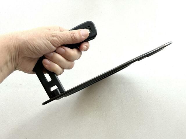 軽くて薄いうえに、ハンドルを立ち上げれば自立します。