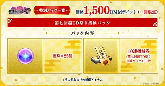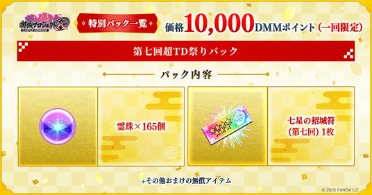 イベント開催期間中、1回限定で「霊珠×165個」などの貴重なアイテムやコラボガチャで登場する最高レア新キャラクターから選べるアイテム、その他便利アイテムがパックとなった「第七回超TD祭りパック」(価格:10,000DMMポイント)で販売します。