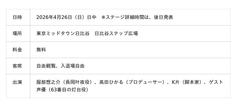 今春放送開始予定のラジオ番組『服部想之介の燈の守り人ラジオ』が、『HIBIYA LIVE FESTIVAL 2026』にて公開収録を実施。『燈の守り人』の主人公・長岡叶夜役の声優・服部想之介(青二プロダクション)がメインパーソナリティを務めます。スペシャルゲスト声優を迎え、臨場感満載の朗読劇を披露するほか、製作陣を交えたトークもお楽しみに。詳細は続報をお待ちください。