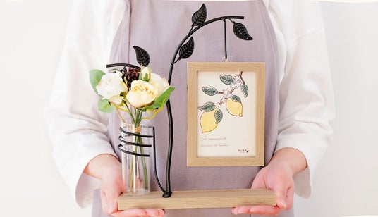 本商品は、L判サイズの写真を両面に飾ることができる吊り下げ型のフォトフレームです。ゆらゆらと揺れるデザインが特徴で、インテリアとしても楽しめる仕様としました。さらに、フレームの横にはガラス製の一輪挿しスペースを設けており、お好みの花を飾ることができます。