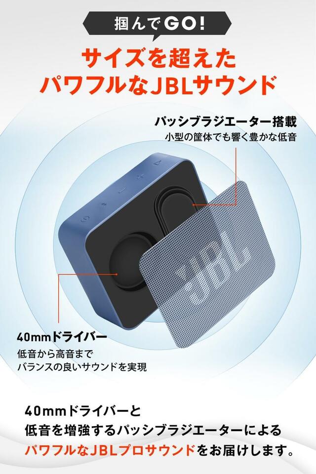 40mmドライバーと低音を強化するパッシブラジエーターを搭載し、コンパクト筐体ながら厚みのあるサウンドを実現。JBLならではのチューニングにより、低音から高音までバランスよく再生できるのが特徴です。