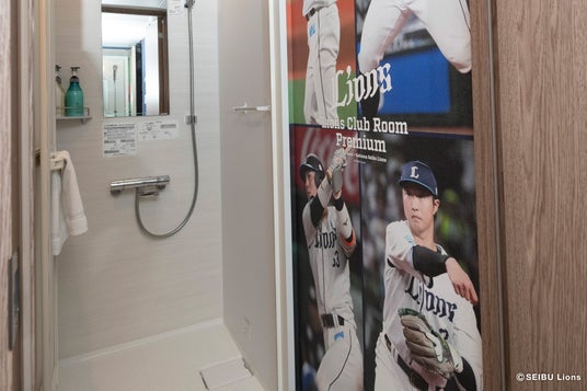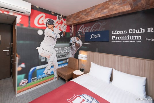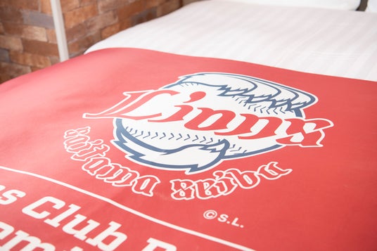 客室内は壁面いっぱいに選手ビジュアルを配置し、まるでスタジアムの中にいるかのような臨場感を演出。ベッドスローや装飾に至るまでライオンズ仕様で統一された空間は、ファンにとってまさに“聖地”とも言える仕上がりです。