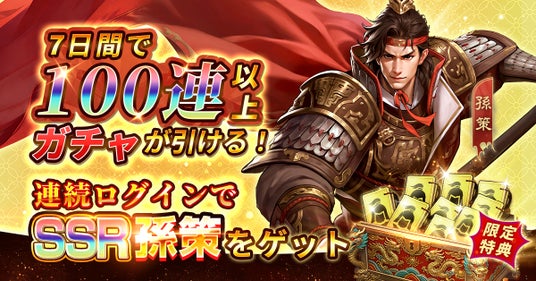 今すぐゲームをダウンロードしていただくと、事前登録特典として「最大30連分のガチャチケット」が獲得可能です。さらに、連続ログインボーナスとして、強力なSSR武将「孫策」を無料でプレゼント!