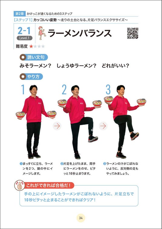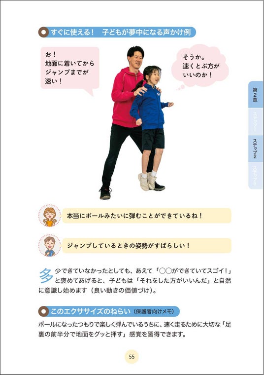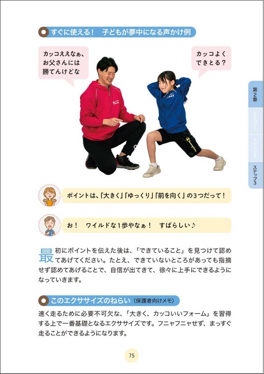 本書では、これまで13年間で、延べ10万人以上の子どもたちを指導してきた著者が考案した「たけのこ式かけっこメソッド」を紹介。かけっこが速くなるために必要な3つの力、「カッコいい姿勢」「ポンポンはずむ」「グングンすすむ」を楽しく習得できるエクササイズが多数収録されています。