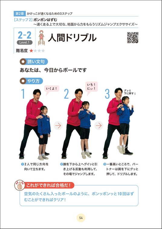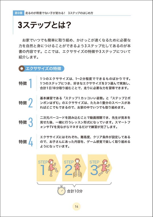 どのエクササイズも親子で楽しくチャレンジすることができ、1日10分で6~9種類のエクササイズをテンポよく行える設計になっています。エクササイズにはそれぞれ、難易度、クリア条件が設定してあるので、お子さんにあった内容を、飽きずにゲーム感覚で楽しく取り組めるようになっています。また紙面にある二次元バーコードを読み込むことで、各エクササイズの動画を視聴可能。先生の真似をするだけで、誰でも簡単にわかりやすく、エクササイズに取り組むことができます。