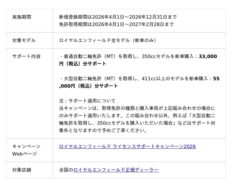 キャンペーン期間の2026年4月1日より2026年12月31日まで間にロイヤルエンフィールド正規ディーラーにてロイヤルエンフィールドの新車をご契約いただき、新規登録が完了したお客様で、かつ2026年4月1日より2027年2月28日までの期間に普通自動二輪免許(MT)もしくは大型自動二輪免許(MT)を取得したお客様に対して下記の通り免許取得費用をサポートいたします。