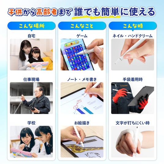 従来は、スマートフォン用・ゲーム用・タブレット用と用途ごとにタッチペンを使い分ける必要がありましたが、本製品はアンドロイド端末やニンテンドースイッチなど幅広いデバイスに対応。1本でさまざまなシーンに対応できるため、持ち替えの手間を減らし、よりスムーズな操作を実現します。