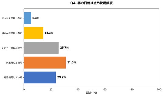 春に日焼け止めを「毎日使用している」人はわずか23.7%にとどまりました。一方で「ほとんど使用しない」「まったく使用しない」を合わせると19.6%となり、約5人に1人が春の紫外線対策をしていない実態が明らかになりました。
