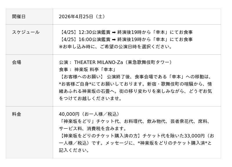 2026年4月、第40回の節目を迎える「神楽坂をどり」。 東急歌舞伎町タワー「THEATER MILANO-Za」での華やかな舞台を鑑賞した後は、神楽坂の料亭「幸本(ゆきもと)」にて、特別なひとときをお過ごしください。