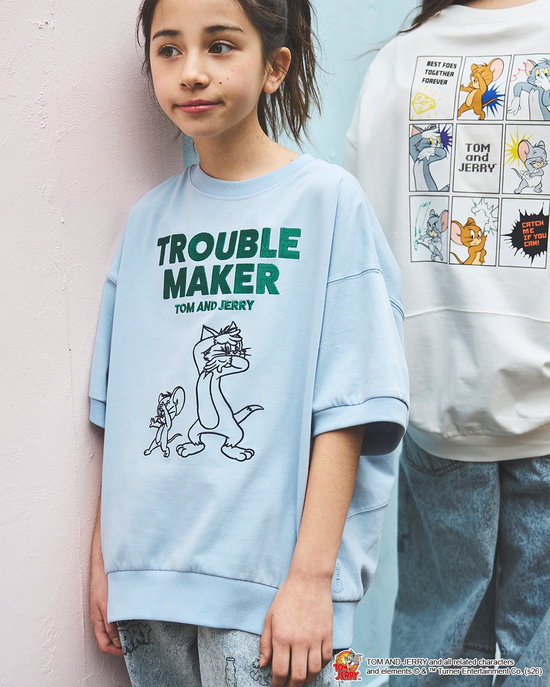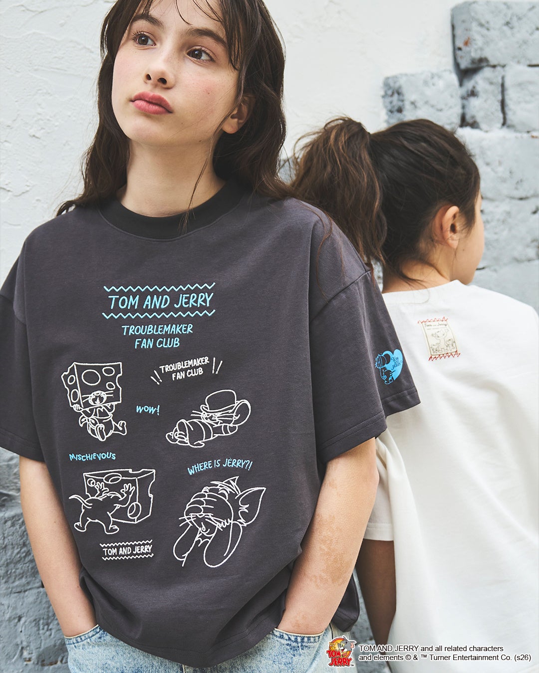 スケッチ風タッチで描いたトムとジェリーのラインアートが印象的なワイドシルエットTシャツ。フロントとバックにコミカルなシーンを配置し、シンプルながら存在感のあるデザインに。袖口のハートモチーフがさりげないアクセントになっています。