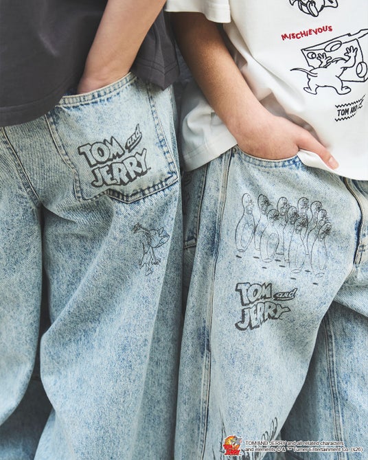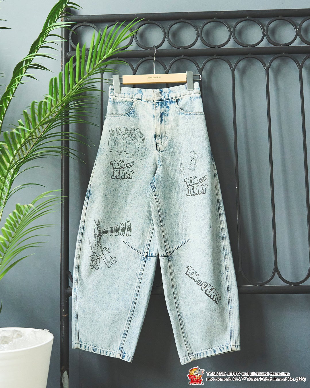 ポンポネットジュニアで毎シーズン人気のパンツシルエットをベースに、丸みのある立体的な“バレルレッグ”に仕上げたデニムパンツ。トムとジェリーのプリントをちりばめ、コーディネートの主役になる存在感のある一本です。動きやすくデイリー使いにも適したデザインで、ストリートテイストをさりげなくプラスします。