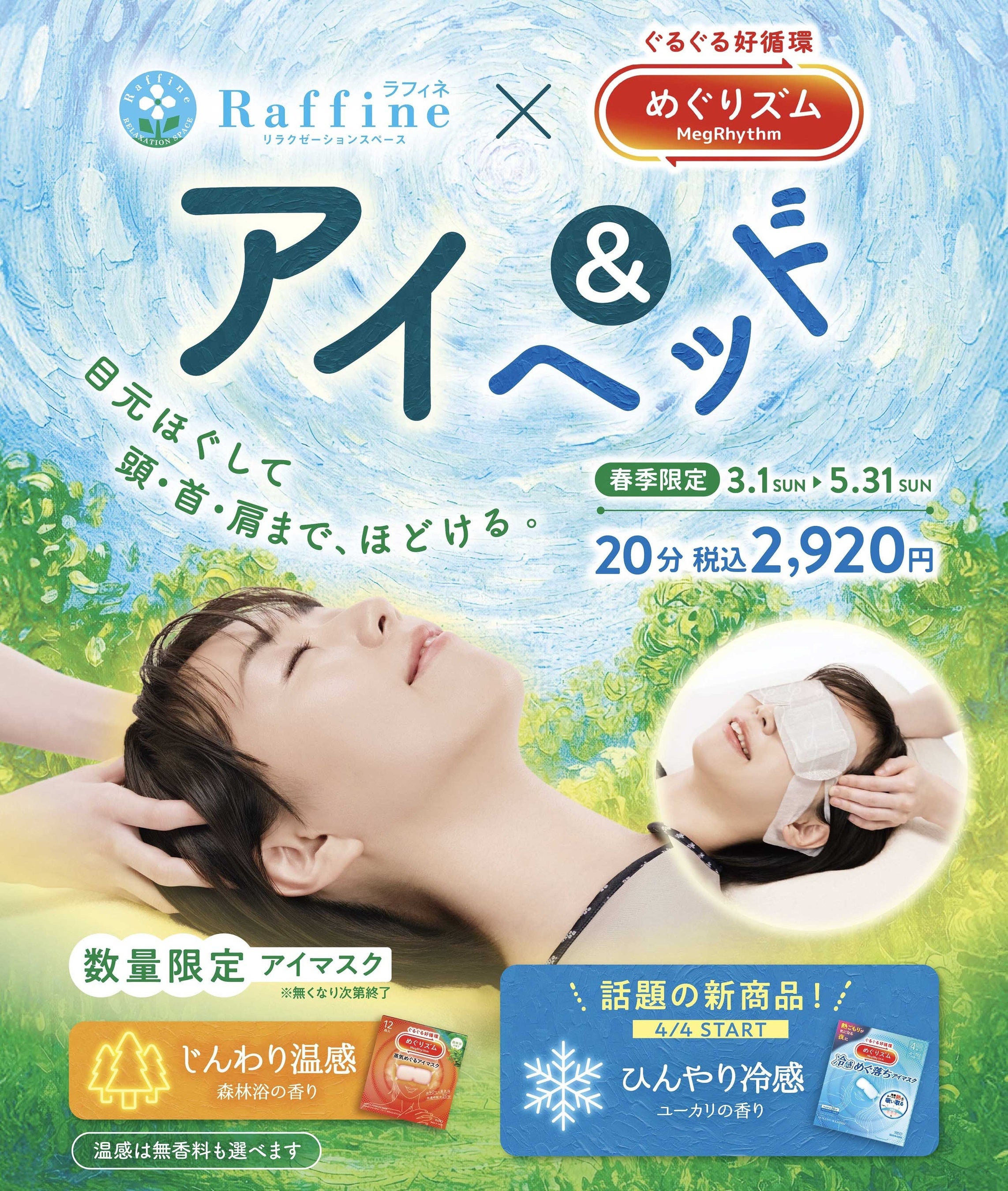 「人々が心身ともに健康で元気に暮らすことができる社会づくりのための事業」に取り組むラフィネグループの株式会社ボディワークホールディングス(代表取締役:清水秀文、住所:東京都中野区)が運営する全国のリラクゼーションスペース「ラフィネ」で現在実施中の春季限定コース「アイ&ヘッド」に、2026年4月4日より、めぐりズムの新商品「冷感めぐ落ちアイマスク」が新登場!