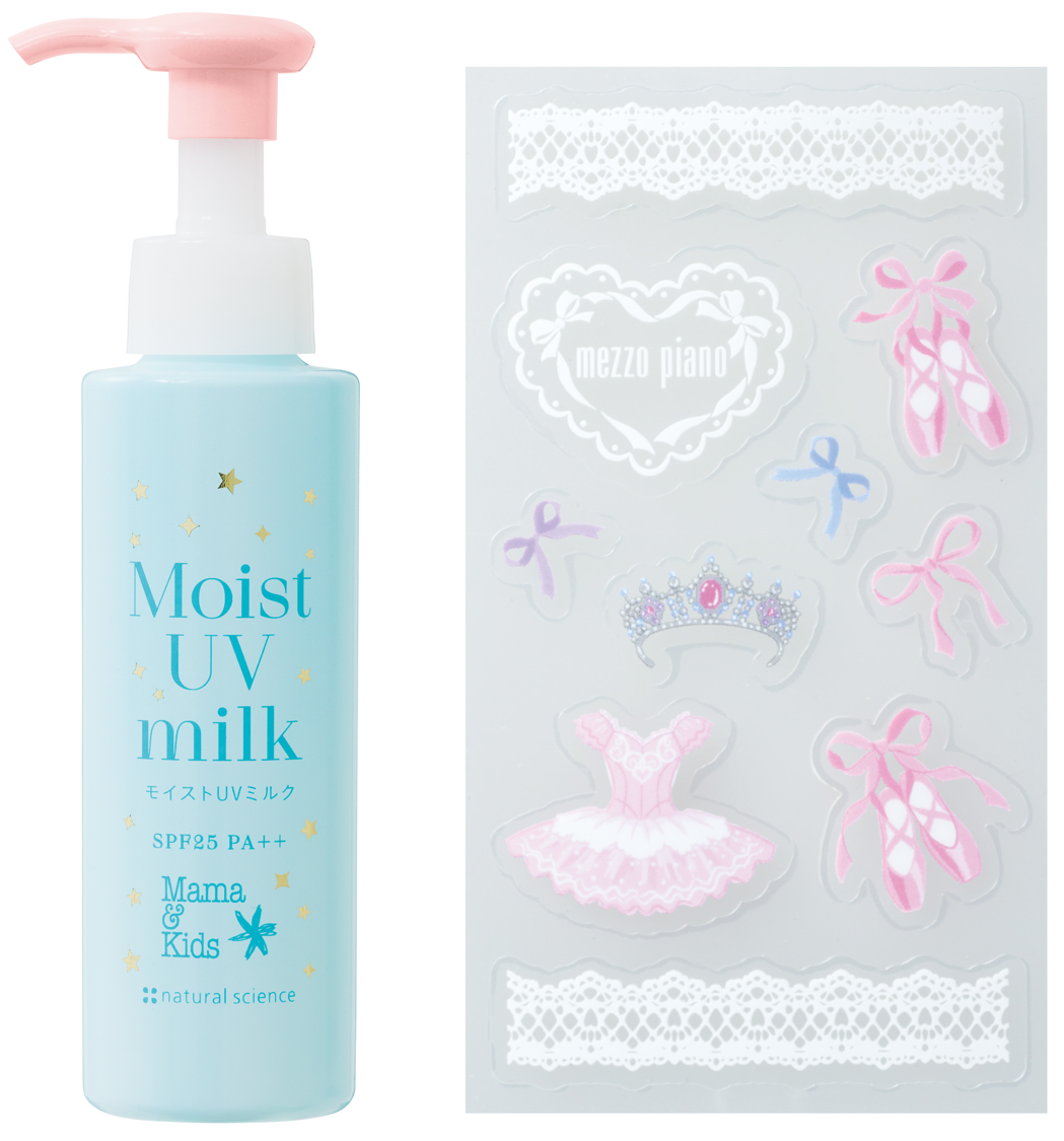 低刺激スキンケアメーカー、株式会社ナチュラルサイエンス(所在地:東京都中央区、代表取締役社長:小松令以子)は、人気の子ども服ブランド「mezzo piano(メゾ ピアノ)」(株式会社ナルミヤ・インターナショナル)とコラボレーションし、オリジナルシールが付いた限定ボトル「ママ&キッズ モイストUVミルク(ドリームデザイン)メゾ ピアノ限定シール付き」(SPF25/PA++)を数量限定にて発売しました。