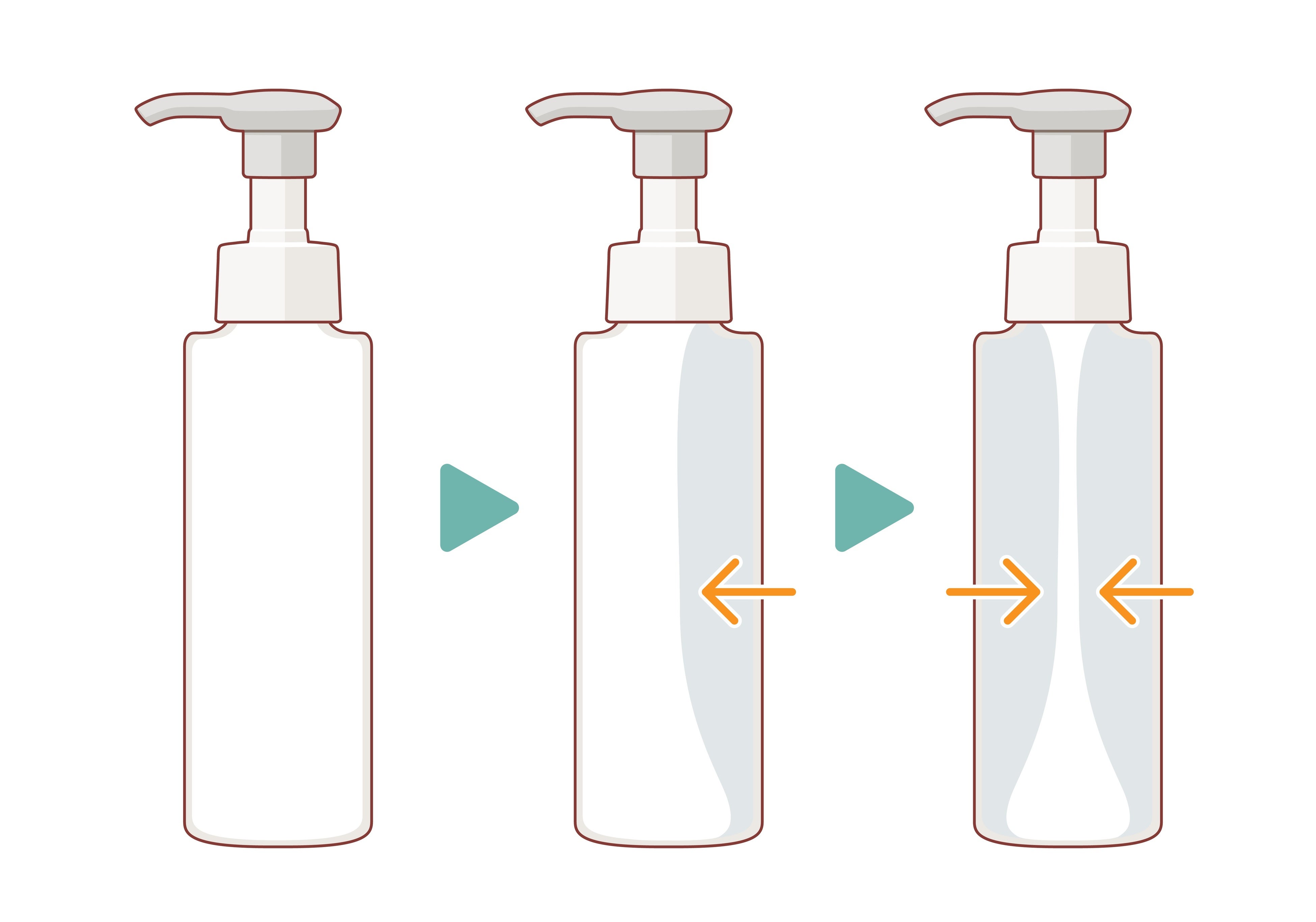 1)衛生的に最後まで使えるフレッシュインナーバッグ採用医薬品製造室並の衛生度を誇る自社工場のクリーンルームで製造。中身が空気に触れないように容器には二重構造のボトル(フレッシュインナーバッグ方式の容器)を採用し、最後まで新鮮&衛生的に使うことができます。