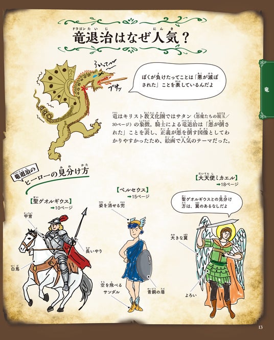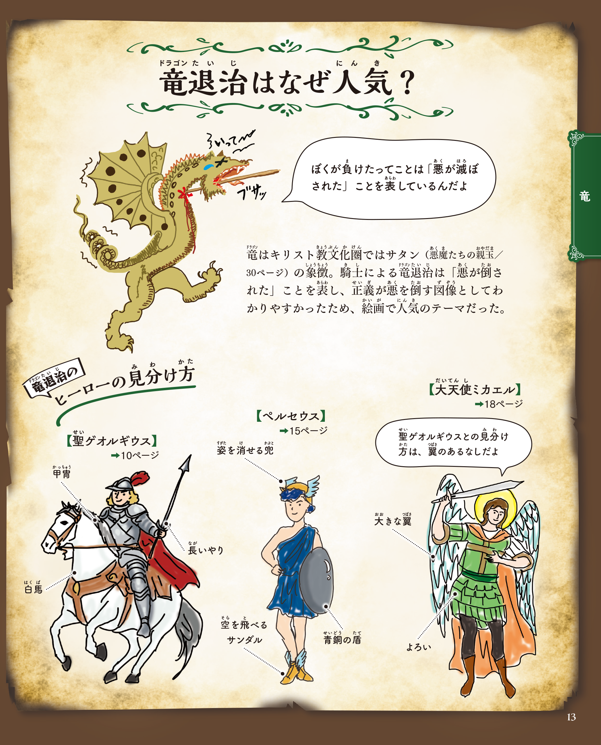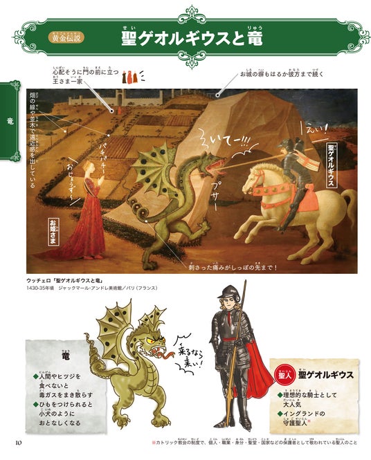 モチーフになったかいぶつや周辺人物の紹介とともに、描かれているものは絵画の上に書き込むような形で解説しています。視覚的にわかりやすく、西洋絵画を難しく感じるお子さまにも馴染みやすい本になっています。