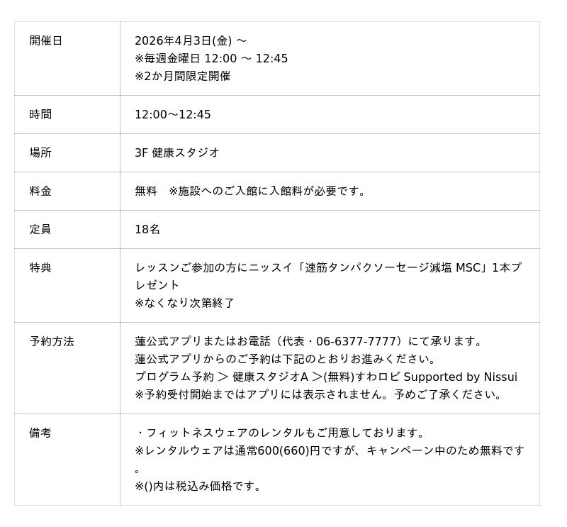 「うめきた温泉 蓮 Wellbeing Park」(総支配人:藤立 達哉、所在地:大阪市)は、2026年4月3日から2か月間、毎週金曜日に、株式会社ニッスイ (代表取締役 社長執行役員:田中 輝、所在地:東京都港区)によるネーミングライツレッスン「すわロビ Supported by Nissui」を開催いたします。