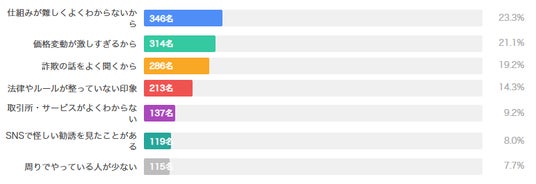 「法律やルールが整っていない印象がある」14.3%(213名)、「取引所・サービスがよくわからない」9.2%(137名)、「SNSで怪しい勧誘を見た」8.0%(119名)、「周りでやっている人が少ない」7.7%(115名)なども理由として挙げられました。