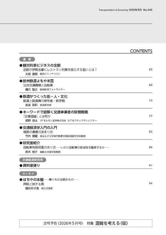一般財団法人 交通経済研究所(東京都新宿区、理事長:高橋眞)は、交通の研究専門誌「運輸と経済」4月号を、2026年4月9日(木)に発売します。