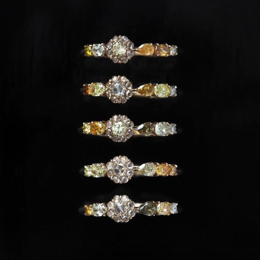 ブラウン、イエロー、オレンジッシュのナチュラルダイヤモンドを一本に