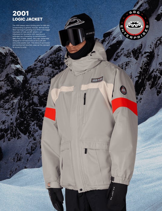 2001年シーズンは、686とスノーボーディングにとって大きな転換点となった時代。その象徴的なプロダクトが、この「LOGIC JACKET」です。創設者マイケル・アキラ・ウエストが、ユタやブラッコムのビッグマウンテンでのライディングから着想を得て生み出した一着で、レイヤリングや可変性という当時としては革新的な思想が反映されています。スポーツウェアとテクニカルアウターを融合させたデザインは、その後の686の方向性を決定づけました。