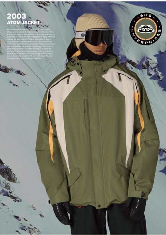2003年に登場したATOM JACKETは、686がデザインと機能の両面で新しい表現に挑戦していた時代を象徴する一着。ショルダーやアーム周りに配置された独自のベンチレーション構造と立体的なエルボーデザインは、当時の“スタイルの進化”を追い求めるライダーたちの感性を色濃く反映しています。HERITAGE COLLECTIONとして復刻された本モデルは、オリジナルのオーバーサイズシルエットを忠実に再現しながら、素材やライニングを現代仕様にアップデートしています。