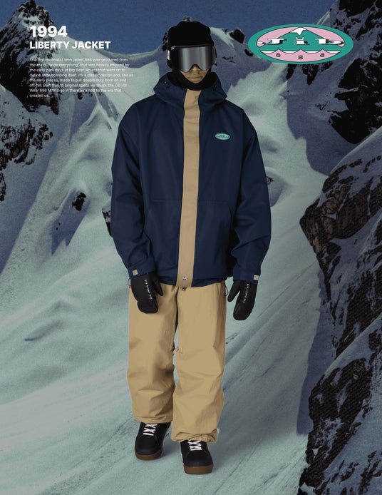 1994年、686が初めて手がけたミニマルなテックジャケットがこのLIBERTY JACKET。すべてがワイドだった時代、ビッグベアでの初期パークシーンからインスピレーションを受けて生まれた一着です。オンヒルとオフヒルを行き来する当時のライディングスタイルに合わせ、シンプルでありながら機能的な設計が、後のスノーボードウェアの在り方を形作りました。HERITAGE COLLECTIONでは、当時のスペックとデザインを忠実に再現しつつ、686の原点を象徴するOG Jib Wear 686 MWロゴをさりげなく配置しています。