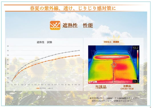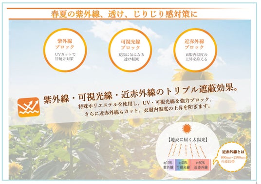 本商品は、紫外線、可視光線、近赤外線を遮蔽する機能を備え、衣服内温度の上昇を抑えることで夏場でも快適な着用環境をサポートいたします。