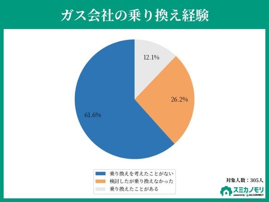 「これまでに都市ガス会社を乗り換えた経験はありますか?」との問いに対し、「乗り換えたことがある」と答えた人は12.1%でした。「検討したが乗り換えなかった」が26.2%、「乗り換えを考えたことがない」が最多の61.6%となり、多くの消費者が比較・検討すらしていないことがわかりました。