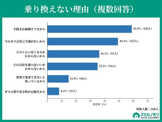 ガス会社を乗り換えたことがない人(n=268)にその理由を聞いたところ、「手続きが面倒そうだから」が59.0%で最多となりました。次いで「今のガス会社に不満がないから」が49.3%、「どのくらい安くなるかわからないから」が36.2%、「どの会社を選べばいいかわからないから」が35.1%と続きました。