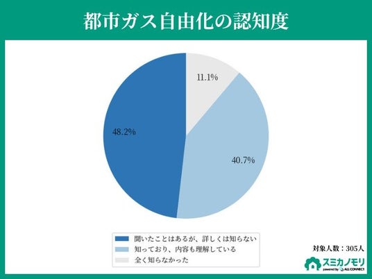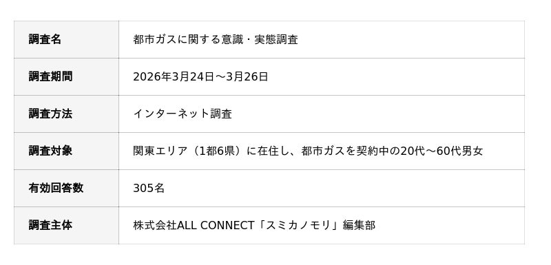 暮らしのインフラ情報メディア「スミカノモリ」(https://lifeline.all-connect.co.jp/)を運営する株式会社ALL CONNECT(本社:福井県福井市、代表取締役社長:岩井宏太)は、関東エリア在住の都市ガス利用利用者305名を対象に「都市ガスに関する意識・実態調査」を実施しました。