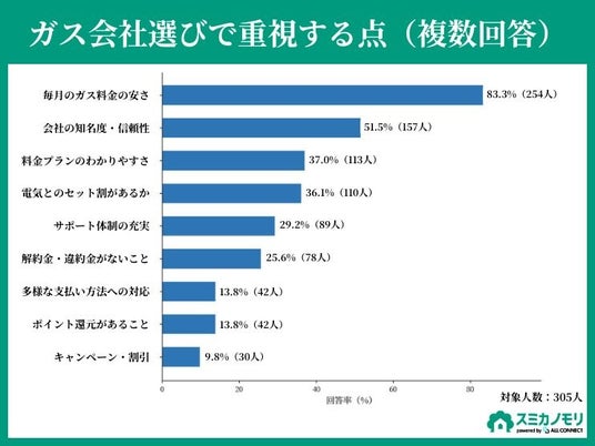 乗り換えていない理由としては「手続きが面倒そうだから」が59.0%で最多となり、次いで「今のガス会社に不満がないから」が49.3%、「どのくらい安くなるかわからないから」が36.2%と続きました。一方で、ガス会社選びで最も重視するポイントは「毎月のガス料金の安さ」が83.3%でトップとなり、消費者の節約ニーズの高さがうかがえる結果となりました。
