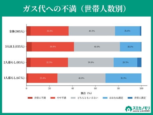毎月のガス代への満足度を聞いたところ、「非常に不満」(3.6%)と「やや不満」(33.1%)を合わせた不満層は全体の36.7%に達しました。世帯人数別に見ると、3人以上のファミリー世帯では不満層が41.3%と、一人暮らし世帯の26.9%を大きく上回る結果となりました。
