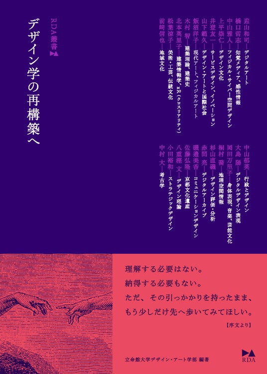 RDA叢書の創刊号『デザイン学の再構築へ』は、総合大学である立命館大学が、美的感性に根差す共創を通じたダイナミックな自己変容の学びの追求を目指して2026年4月に新設した、「デザイン・アート学部」の教員22名による11篇の対話セッションを収録したものです。
