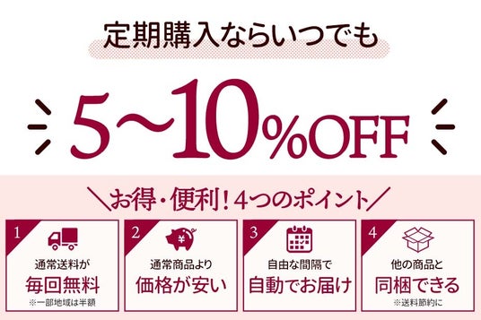 さらに、定期購入をご利用いただくことで、通常価格より5~10%OFFの割引が常時適用されるため、継続するほどお求めやすくなる点も魅力です。お届け間隔や数量の変更も可能で、ライフスタイルに合わせて柔軟に調整できる利便性も兼ね備えています。