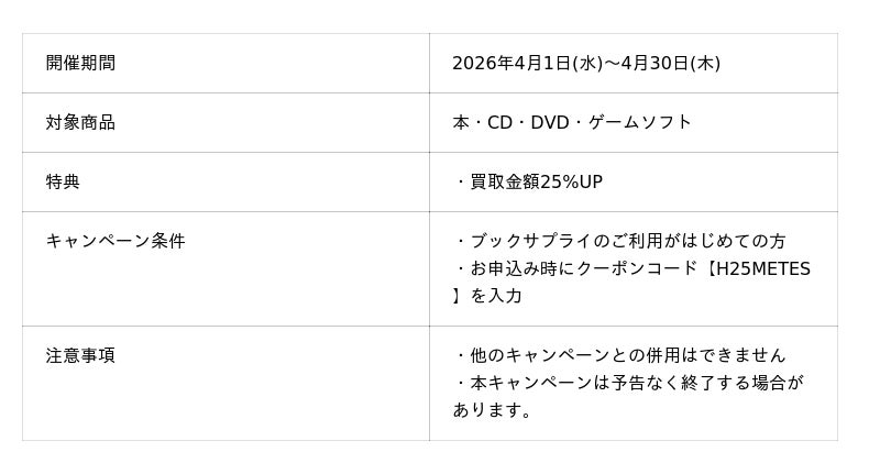 株式会社ブックサプライ(本社:大阪府吹田市、代表取締役:藪田真吾)は、はじめて宅配買取サービスをご利用いただく方を対象に、買取金額が25%アップとなる「はじめての方限定キャンペーン」を、2026年4月1日(水)~4月30日(木)の期間限定で開催中です。
