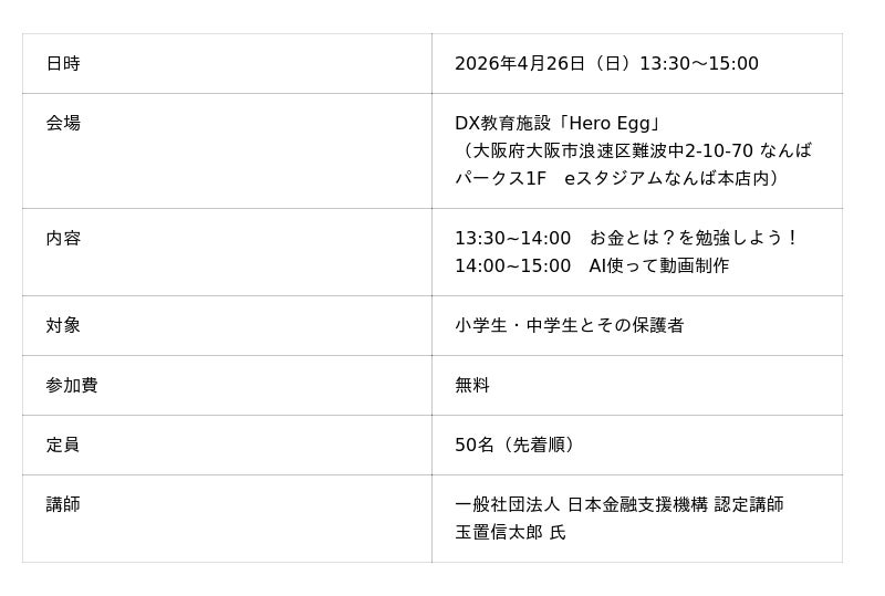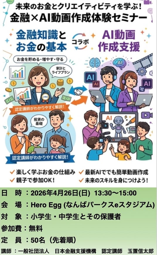 株式会社Meta Heroes(本社所在地:大阪府大阪市、代表取締役:松石和俊、以下「当社」)は、一般社団法人 日本金融支援機構の認定講師を招き、2026年4月26日(日)、なんばパークス内のDX教育施設「Hero Egg」にて、小・中学生とその保護者を対象とした「金融×AI動画作成体験セミナー」を無料開催いたします。