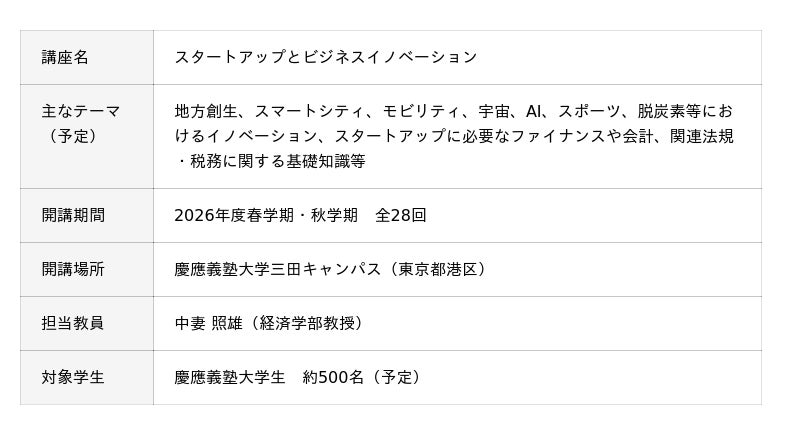 KPMGコンサルティング株式会社(本社:東京都千代田区、代表取締役:関 穣、田口 篤、知野 雅彦、以下、KPMGコンサルティング)と慶應義塾大学(所在地:東京都港区、塾長:伊藤 公平)は、最新のテクノロジーの動向からアカウンティングやファイナンス、法律など、“起業”を含むスタートアップに必要な知識を体系的に学ぶ寄附講座「スタートアップとビジネスイノベーション」を、同大学三田キャンパス(所在地:東京都港区)において、2026年4月10日(金)から開講します。本寄附講座は5年連続での開講となります。