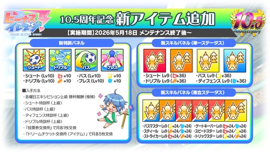 「iOS版サービスイン10.5周年」を記念して、新特訓パネルとスキルパネル各種を追加予定です。さらなるチーム強化、選手育成にお役立てください!