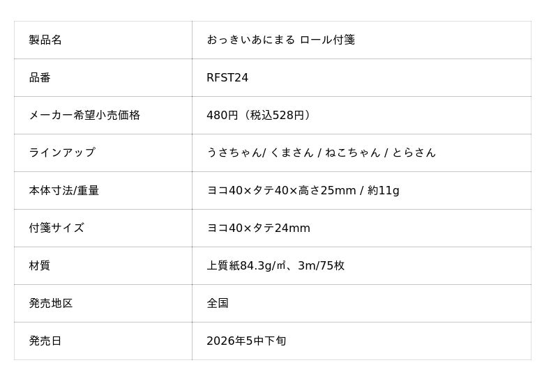 ナカバヤシ株式会社(本社:大阪市中央区、社長:中林一良)はダイアリーやノートのデコにも使用できる付箋「おっきいあにまる ロール付箋」を全国で2026年5月中旬より順次発売します。