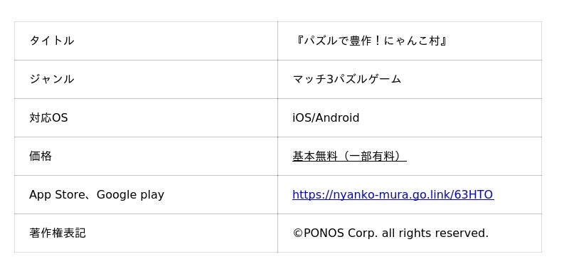 ポノス株式会社(本社:京都府京都市、代表取締役:辻子依旦、以下「ポノス」)はスマートフォン向けゲームアプリ『にゃんこ大戦争』において、『パズルで豊作!にゃんこ村』とのコラボレーションイベントを2026年4月3日(金)11:00から開始いたしました。