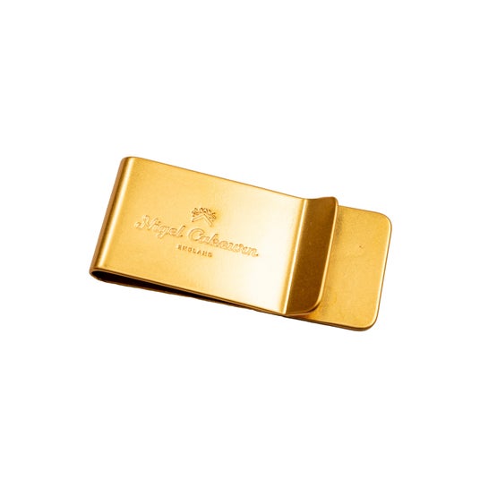 真鍮にナイジェル・ケーボンのロゴが刻まれた、堅牢なマネークリップ。