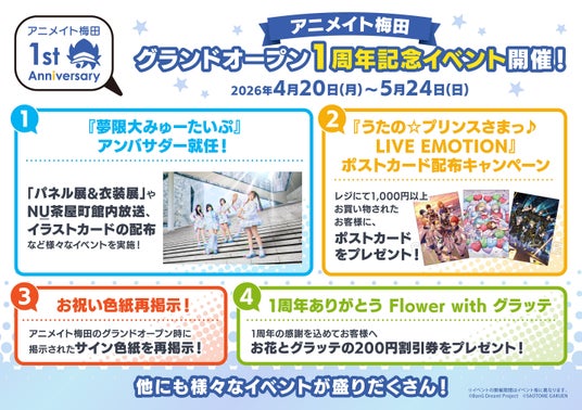 株式会社アニメイトは、「アニメイト梅田」のグランドオープン1周年を記念して、様々なイベントを実施いたします。