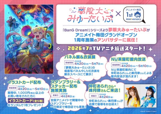 そんなアニメイト梅田は皆様のお陰で無事グランドオープンから1周年を迎えることが出来ました!その記念とお客様への感謝を伝えるイベントを4月20日より順次開催いたします。今回アニメイト梅田1周年のアンバサダーには、『BanG Dream!』プロジェクトより『夢限大みゅーたいぷ』が就任!店内展示スペース「ステージはん」での衣装展示や、NU茶屋町内で流れる館内放送、イラストカードの配布などを実施するほか、1周年当日には『夢限大みゅーたいぷ』の仲町あられさんと峰月律さんが入口にてお客様をお出迎え!