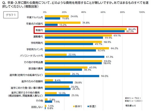 卒業・入学に関わる費用について、「制服代」の準備が難しいと回答した世帯は、新中学1年生で84.4%、新高校1年生で82.3%と、2022年の調査開始以来、最も高い割合となった。