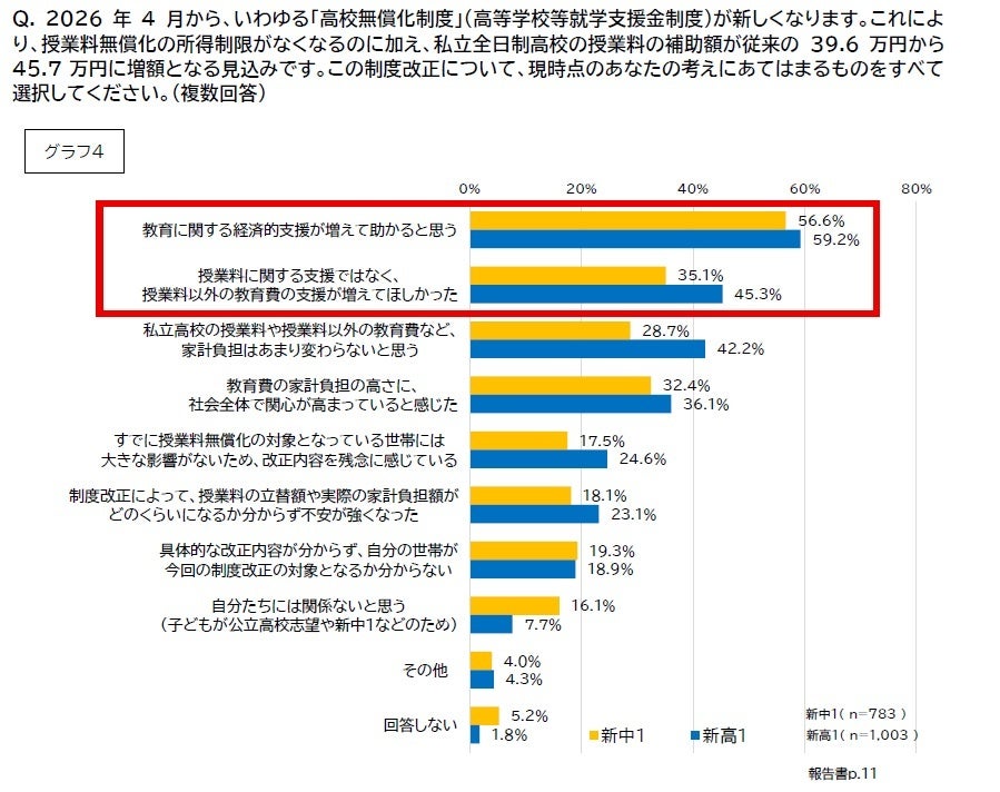 2026年4月からの「高校無償化」(高等学校等就学支援金制度改正)について、回答者の半数以上が「教育に関す る経済的支援が増えて助かると思う」と肯定的に捉えている一方、新高校1年生の保護者は4割以上が「授業料に関する支援ではなく、授業料以外の教育費の支援が増えてほしかった」と回答した。