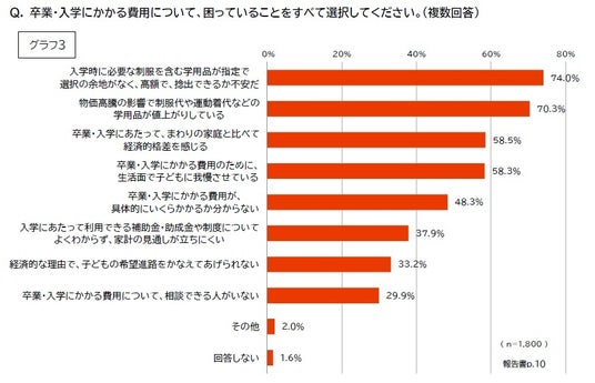 卒業・入学に関する困りごとを聞いたところ、7割以上の保護者が高額な指定学用品や物価高騰による学用品の値上げなどの経済的な負担を挙げた。また、6割近くの保護者がこの時期に周囲と比べて経済的格差を感じる、子どもに我慢させている、と感じるなど気持ちの面でも負担感があることが分かった。