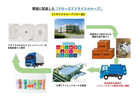 限りある資源を効率的に使いながら、持続可能な形で再利用、再資源化し、紙資源のリサイクルにも取り組む事業、それが「クローズドループリサイクル」です。企業などから回収した使用済みの紙(古紙)を原料として活用し、トイレットペーパーへリサイクルします。そして、そのリサイクルしたトイレットペーパーを古紙回収元の企業に戻し、循環します。主に自社ビルを保有する企業や団体に好評です。