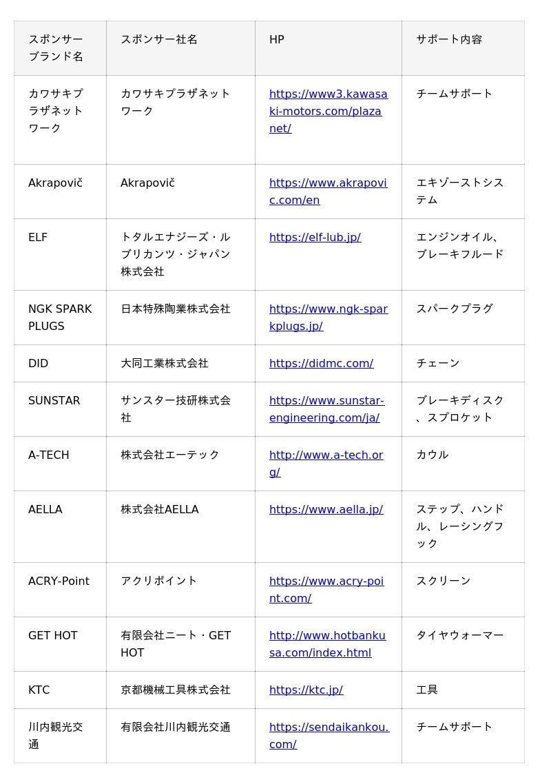 株式会社カワサキモータースジャパンはKawasaki Plaza Racing Teamのレース活動において、カワサキプラザネットワークをはじめとする様々な企業様との協力体制のもとモータースポーツ活動に取り組んでまいります。